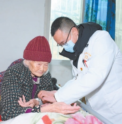 四川省眉山市丹棱縣仁美鎮(zhèn)雄義村,村醫(yī)徐遠(yuǎn)利(右)為92歲的張玉珍測量血壓。