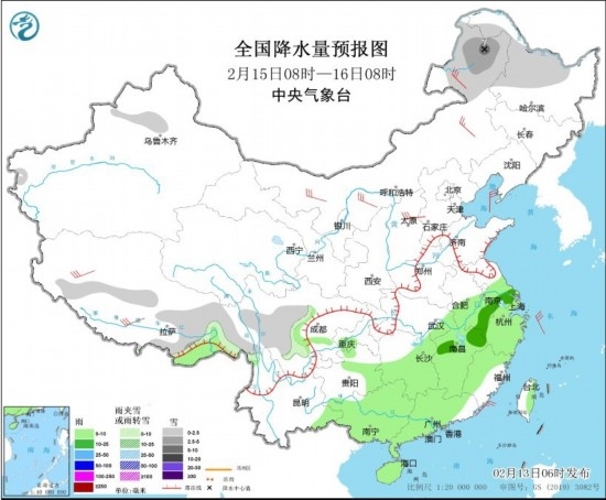 全國降水量預(yù)報(bào)圖(2月15日08時(shí)-16日08時(shí)) 圖片來源:中央氣象臺網(wǎng)站