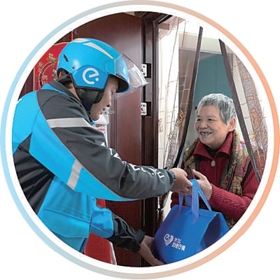 外賣騎手張魁在社區(qū)開展助老送餐服務。