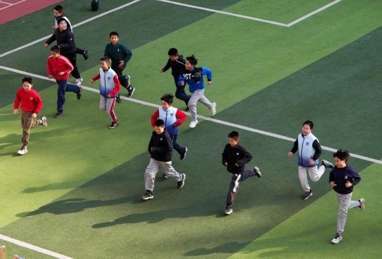 2月21日,在北京市宣武師范學校附屬第一小學,學生在體育課上跑步熱身。新華社記者 鞠煥宗 攝