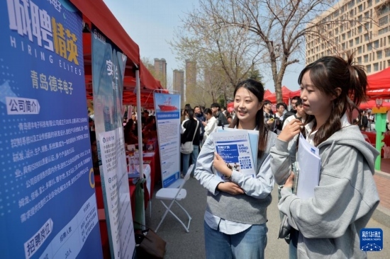 4月11日,學生在山東青島科技大學2025年春季綜合類大型雙選會招聘活動現(xiàn)場查看企業(yè)資料。