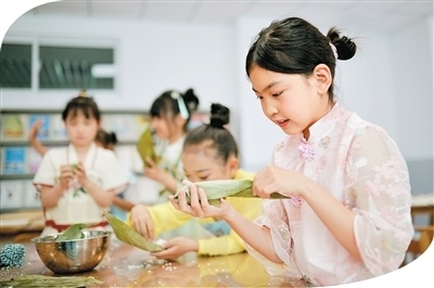 在山東省青島市市北區(qū)杭州路小學(xué),學(xué)生體驗包粽子。