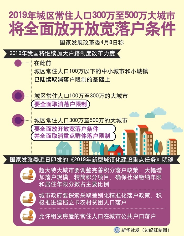 國家發(fā)展改革委8日稱,2019年我國將繼續(xù)加大戶籍制度改革力度,在此前城區(qū)常住人口100萬以下的中小城市和小城鎮(zhèn)已陸續(xù)取消落戶限制的基礎(chǔ)上,城區(qū)常住人口100萬至300萬的大城市要全面取消落戶限制;城區(qū)常住人口300萬至500萬的大城市要全面放開放寬落戶條件,并全面取消重點(diǎn)群體落戶限制。