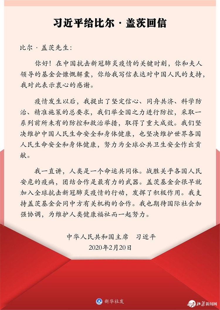 2月20日,在給美國(guó)蓋茨基金會(huì)聯(lián)席主席比爾·蓋茨的回信中,習(xí)近平主席這樣寫(xiě)道。