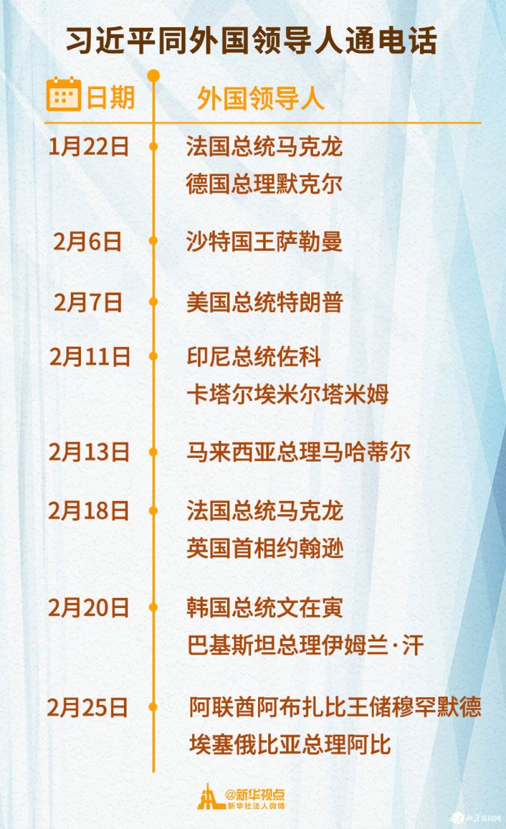 2月以來(lái),習(xí)近平主席已先后同11位外國(guó)領(lǐng)導(dǎo)人通電話,涉及國(guó)家遍及亞洲、歐洲、非洲、美洲等地區(qū)。