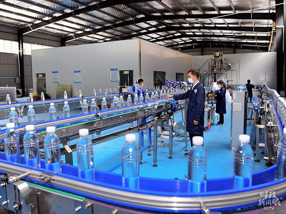 △湖南邵陽市桐山鄉(xiāng)椒林村充分利用當(dāng)?shù)厣饺Y源,加工生產(chǎn)瓶裝水。