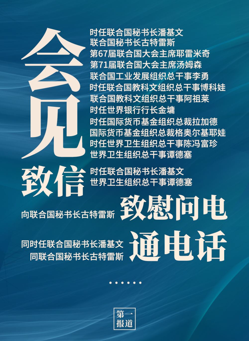 2013年以來(lái),習(xí)主席通過(guò)會(huì)見(jiàn)、通話、致信函等多種方式同聯(lián)合國(guó)主要官員保持密切溝通?;?dòng)對(duì)象包括聯(lián)合國(guó)秘書(shū)長(zhǎng)、聯(lián)合國(guó)大會(huì)主席,還有聯(lián)合國(guó)工業(yè)發(fā)展組織、聯(lián)合國(guó)教科文組織、世界銀行、國(guó)際貨幣基金組織、世界衛(wèi)生組織等聯(lián)合國(guó)專門(mén)機(jī)構(gòu)主要負(fù)責(zé)人。