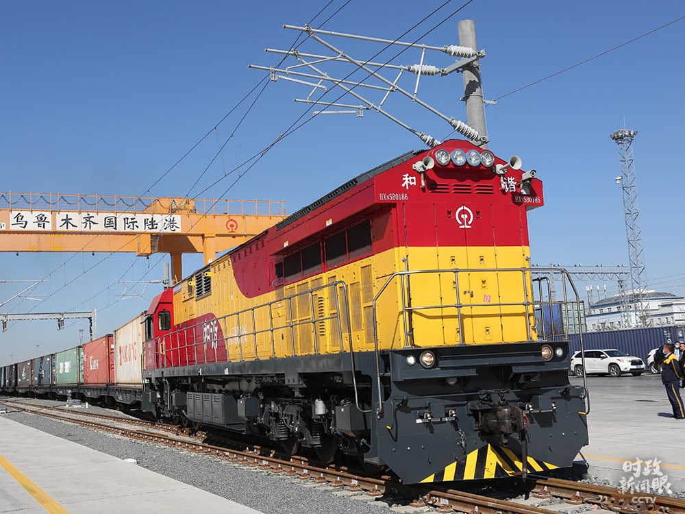 △9月8日,烏魯木齊國(guó)際陸港區(qū),一列滿(mǎn)載日用品的中歐班列啟程。
