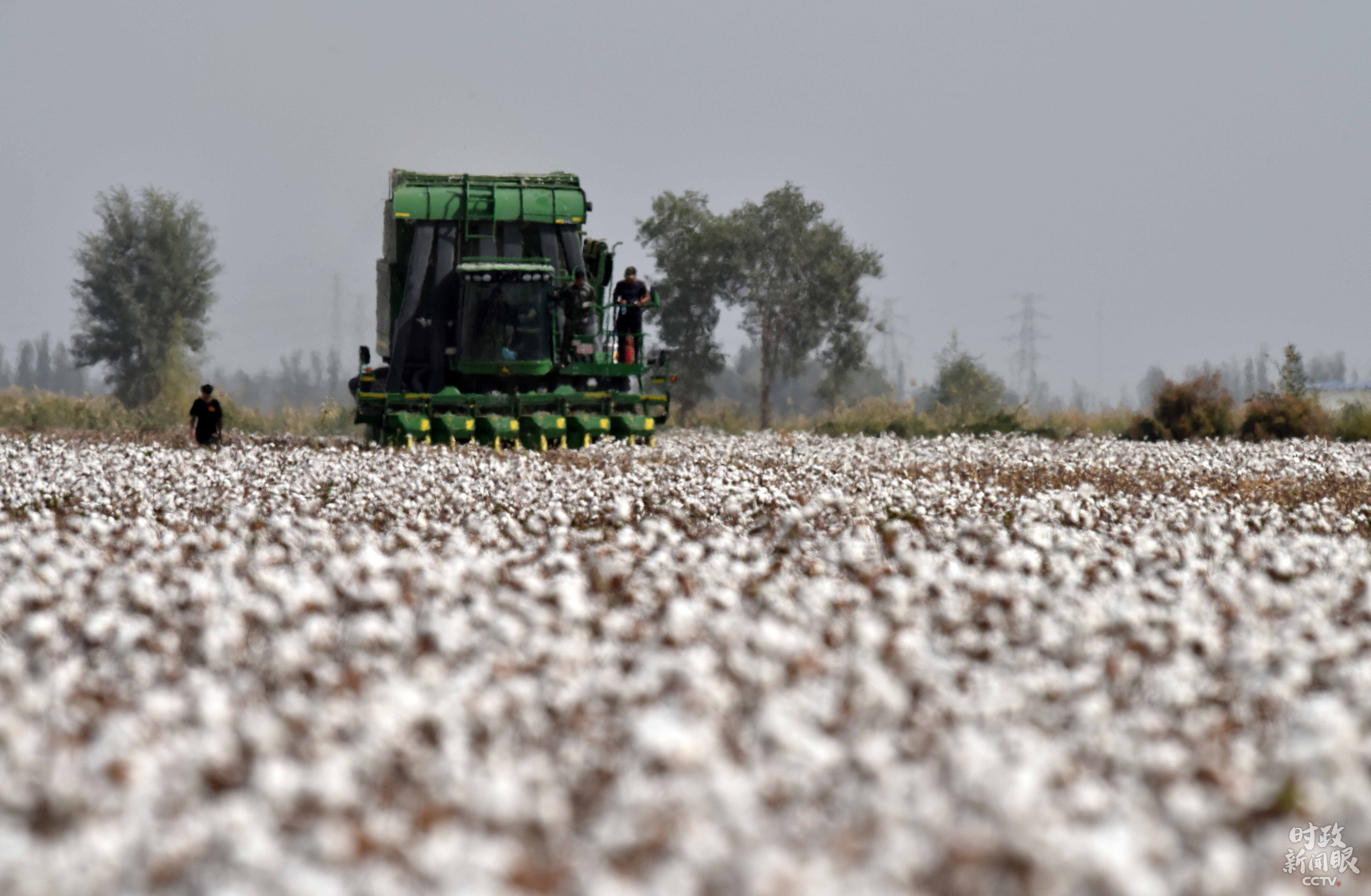 △新疆庫(kù)爾勒市普惠農(nóng)場(chǎng)內(nèi),大型采棉機(jī)正在采收棉花。