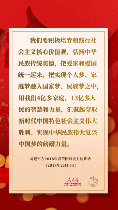 我們要積極培育和踐行社會(huì)主義核心價(jià)值觀,弘揚(yáng)中華民族傳統(tǒng)美德,把愛家和愛國(guó)統(tǒng)一起來,把實(shí)現(xiàn)個(gè)人夢(mèng)、家庭夢(mèng)融入國(guó)家夢(mèng)、民族夢(mèng)之中,用我們4億多家庭、13億多人民的智慧和力量,匯聚起奪取新時(shí)代中國(guó)特色社會(huì)主義偉大勝利、實(shí)現(xiàn)中華民族偉大復(fù)興中國(guó)夢(mèng)的磅礴力量。