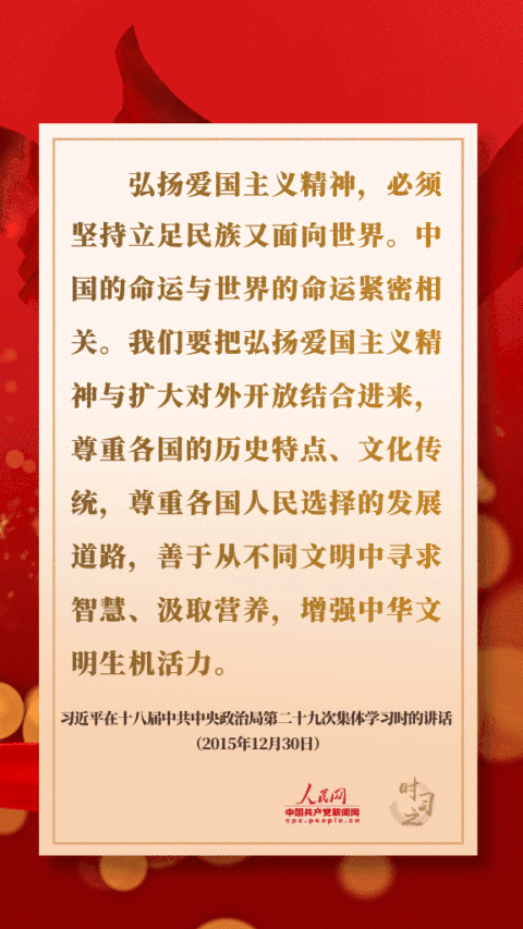 弘揚(yáng)愛國(guó)主義精神,必須堅(jiān)持立足民族又面向世界。中國(guó)的命運(yùn)與世界的命運(yùn)緊密相關(guān)。我們要把弘揚(yáng)愛國(guó)主義精神與擴(kuò)大對(duì)外開放結(jié)合進(jìn)來,尊重各國(guó)的歷史特點(diǎn)、文化傳統(tǒng),尊重各國(guó)人民選擇的發(fā)展道路,善于從不同文明中尋求智慧、汲取營(yíng)養(yǎng),增強(qiáng)中華文明生機(jī)活力。