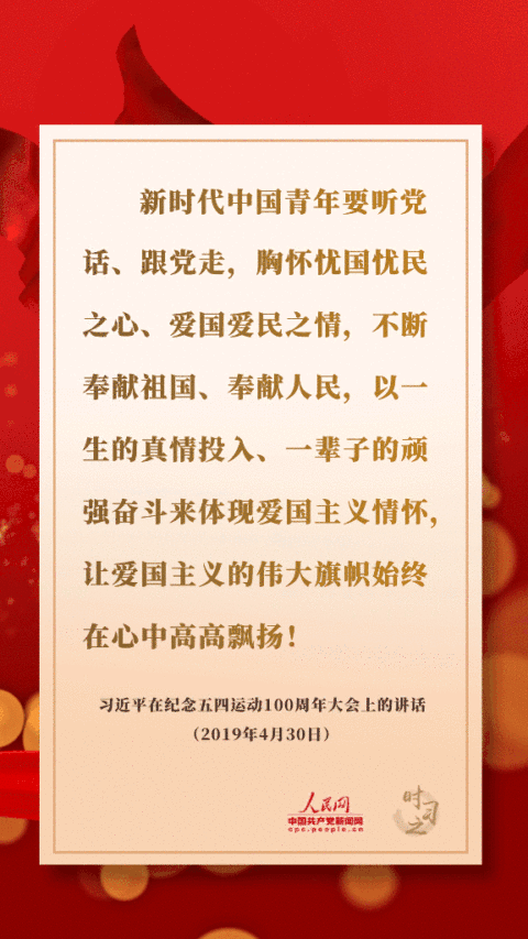 新時(shí)代中國(guó)青年要聽黨話、跟黨走,胸懷憂國(guó)憂民之心、愛國(guó)愛民之情,不斷奉獻(xiàn)祖國(guó)、奉獻(xiàn)人民,以一生的真情投入、一輩子的頑強(qiáng)奮斗來體現(xiàn)愛國(guó)主義情懷,讓愛國(guó)主義的偉大旗幟始終在心中高高飄揚(yáng)!