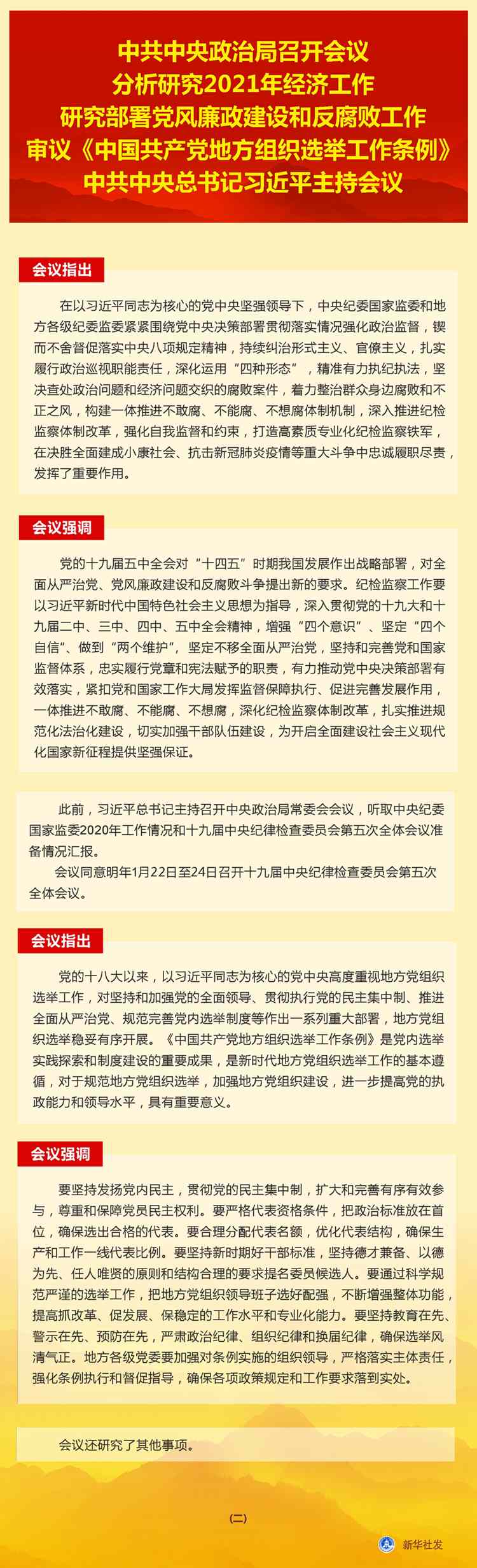 新華社北京12月11日電 中共中央政治局12月11日召開會(huì)議,分析研究2021年經(jīng)濟(jì)工作;聽取中央紀(jì)委國(guó)家監(jiān)委工作匯報(bào),研究部署2021年黨風(fēng)廉政建設(shè)和反腐敗工作;審議《中國(guó)共產(chǎn)黨地方組織選舉工作條例》。中共中央總書記習(xí)近平主持會(huì)議。