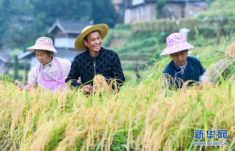 貴州省從江縣加榜鄉(xiāng)加車村的農(nóng)民在收割水稻(2020年9月19日攝)。新華社記者 楊文斌 攝