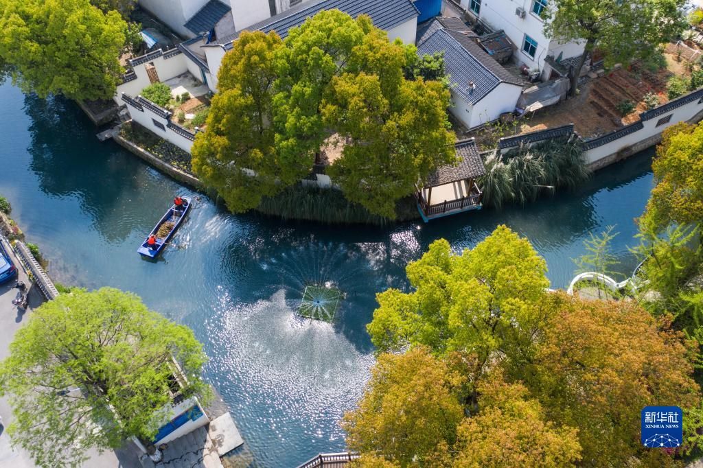 在浙江省長(zhǎng)興縣龍山街道渚山村,保潔人員進(jìn)行日常河道護(hù)理巡查(2020年4月9日攝,無(wú)人機(jī)照片)。新華社記者徐昱攝