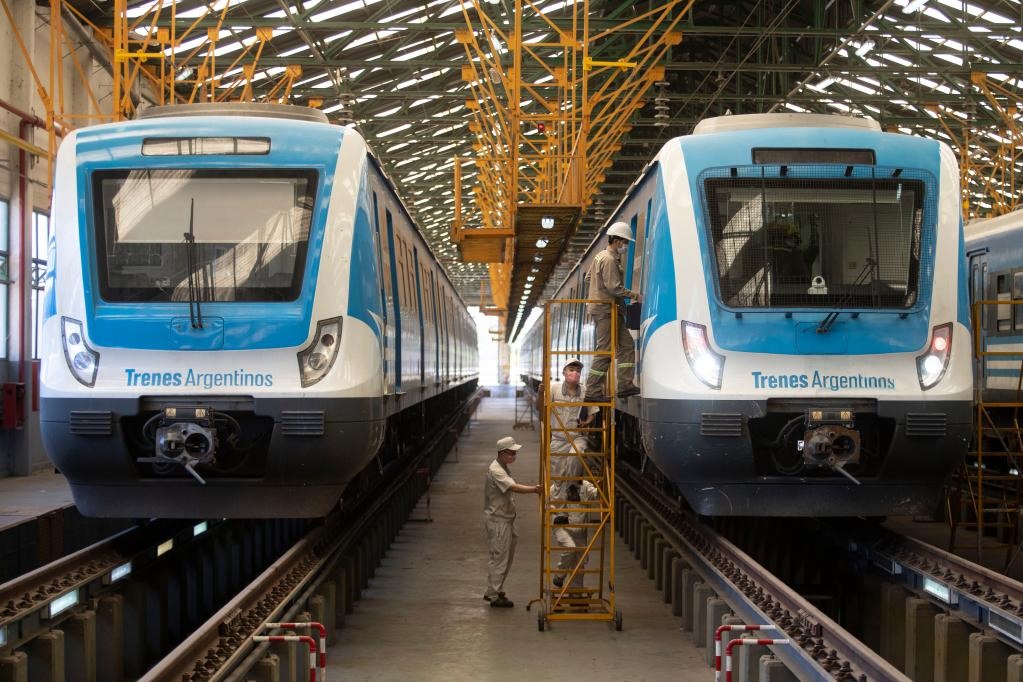 2020年11月16日,在布宜諾斯艾利斯省拉瓦約,中國和阿根廷技術(shù)人員對(duì)阿根廷城際鐵路列車進(jìn)行日常檢查。