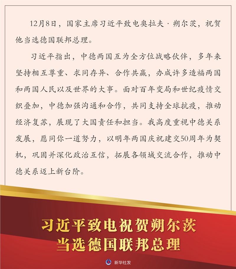 新華社北京12月8日電 12月8日,國家主席習近平致電奧拉夫·朔爾茨,祝賀他當選德國聯(lián)邦總理。
