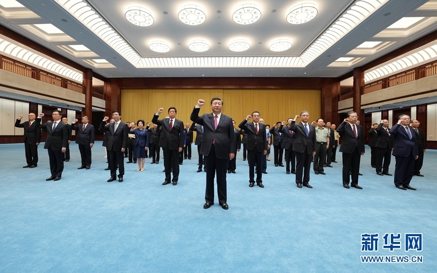 2021年6月18日,黨和國家領(lǐng)導(dǎo)人習(xí)近平、李克強(qiáng)、栗戰(zhàn)書、汪洋、王滬寧、趙樂際、韓正、王岐山等在中國共產(chǎn)黨歷史展覽館參觀“‘不忘初心、牢記使命’中國共產(chǎn)黨歷史展覽”。這是參觀結(jié)束后,習(xí)近平帶領(lǐng)黨員領(lǐng)導(dǎo)同志一起重溫入黨誓詞。新華社記者 李學(xué)仁 攝
