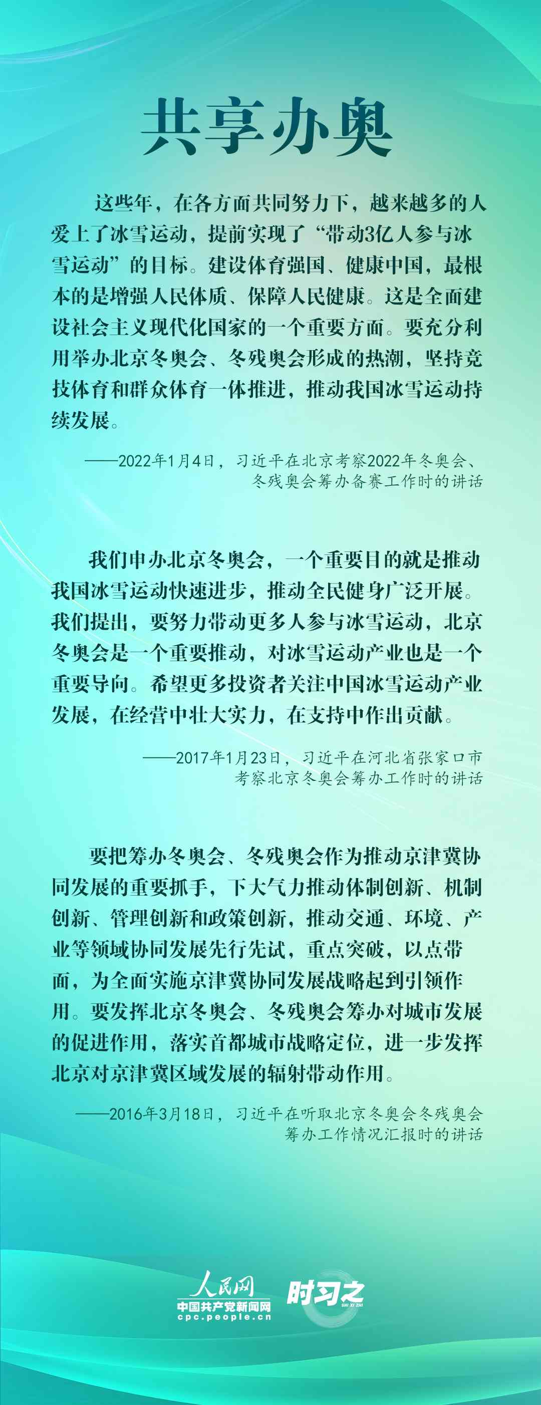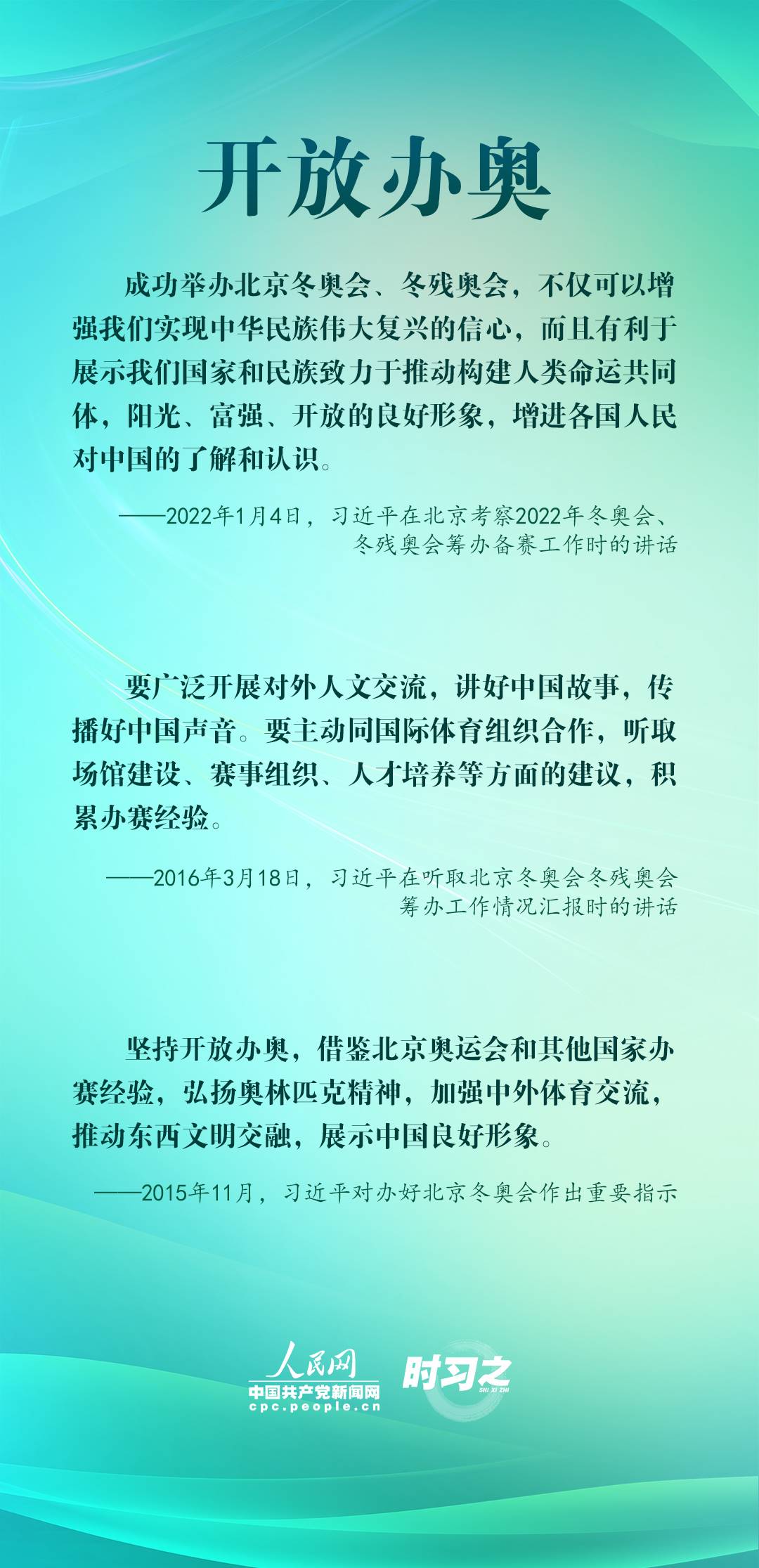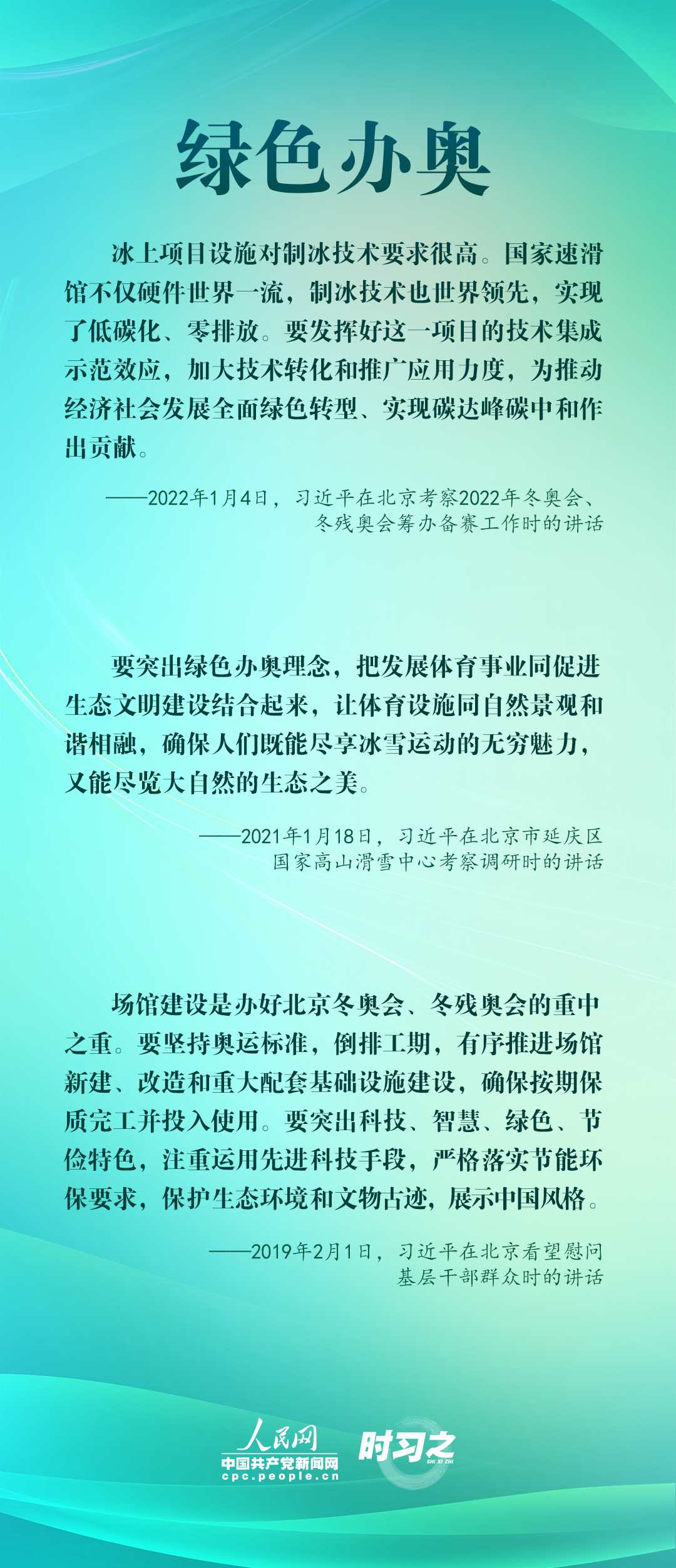 1月4日,習(xí)近平在北京考察2022年冬奧會、冬殘奧會籌辦備賽工作,指出“要堅(jiān)持綠色辦奧、共享辦奧、開放辦奧、廉潔辦奧的理念,突出科技、智慧、綠色、節(jié)儉特色”。辦好北京冬奧會、冬殘奧會,是中國向國際社會作出的莊嚴(yán)承諾。習(xí)近平多次調(diào)研并強(qiáng)調(diào)綠色、共享、開放、廉潔的辦奧理念。