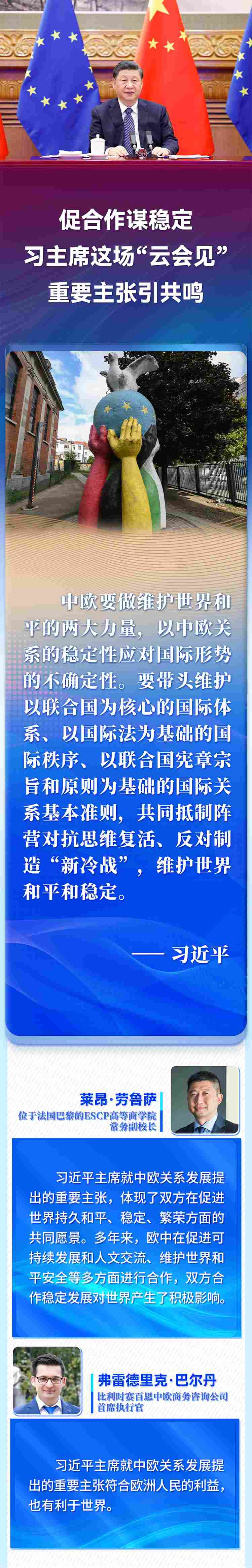 國家主席習(xí)近平4月1日晚在北京以視頻方式會見歐洲理事會主席米歇爾和歐盟委員會主席馮德萊恩。歐洲多國人士高度評價習(xí)近平主席就中歐關(guān)系、烏克蘭危機(jī)等問題提出的重要主張,認(rèn)為會晤為雙方關(guān)系持續(xù)健康發(fā)展作出戰(zhàn)略引領(lǐng),為復(fù)雜動蕩的國際局勢注入穩(wěn)定性。