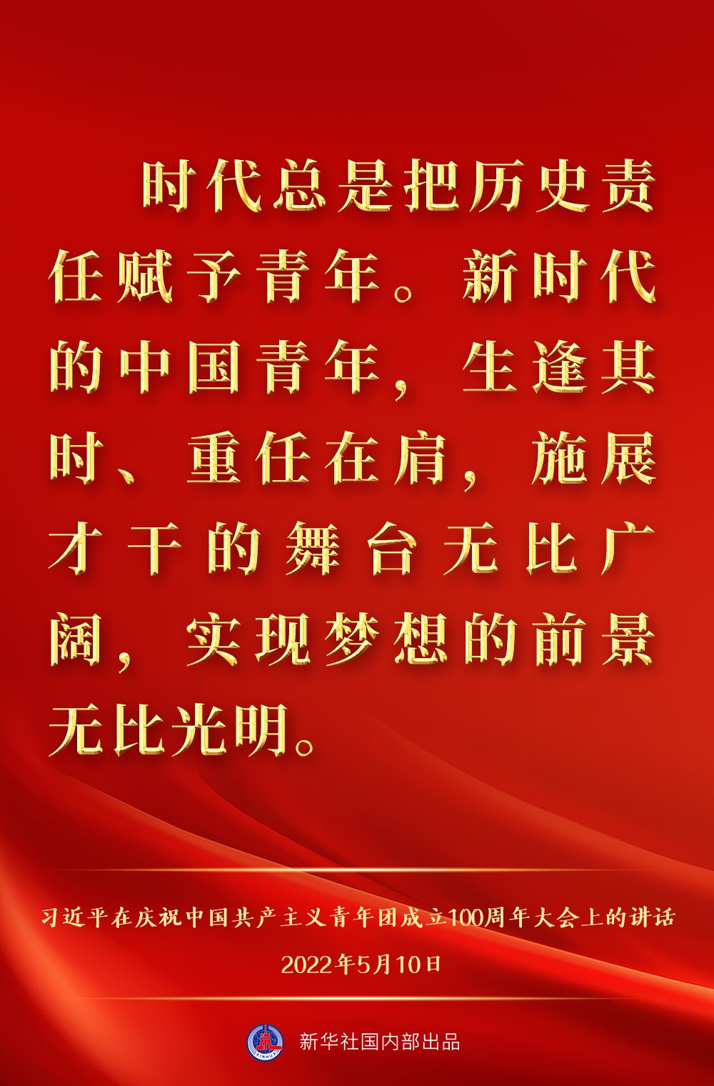 5月10日上午,中共中央總書記、國家主席、中央軍委主席習(xí)近平出席慶祝中國共產(chǎn)主義青年團(tuán)成立100周年大會并發(fā)表重要講話,一起來看金句。