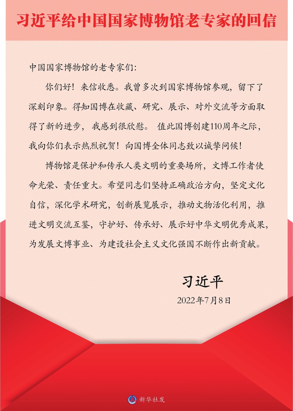 7月8日,中共中央總書記、國(guó)家主席、中央軍委主席習(xí)近平給中國(guó)國(guó)家博物館的老專家回信,在國(guó)博創(chuàng)建110周年之際,向國(guó)博全體同志致以熱烈祝賀和誠(chéng)摯問候。