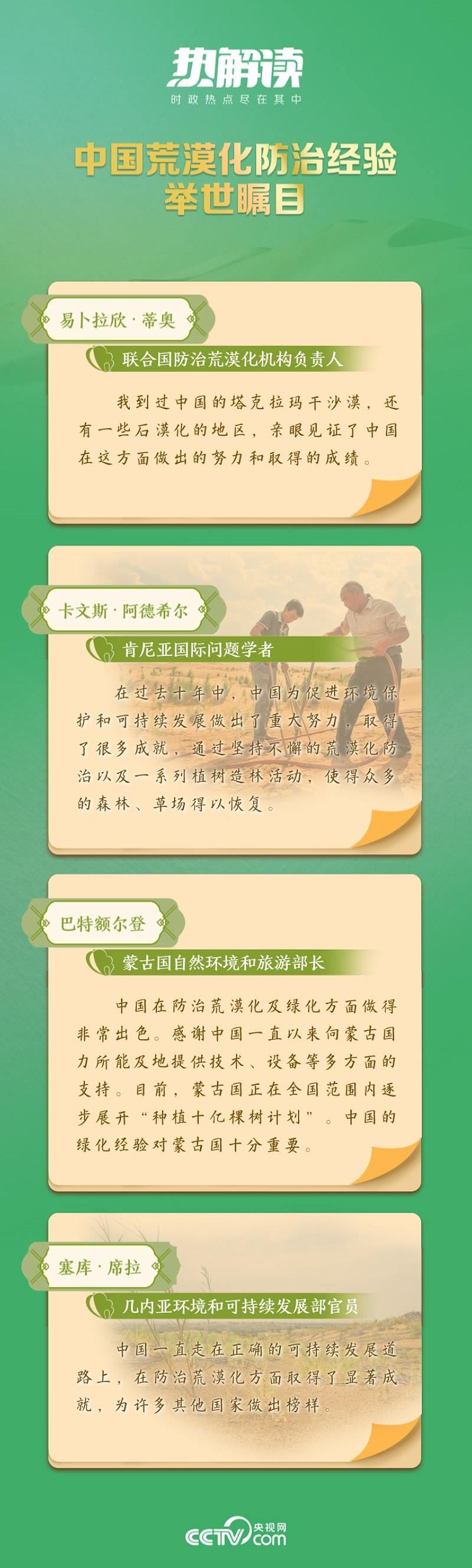 從“荒漠化防治是人類功在當(dāng)代、利在千秋的偉大事業(yè)”,到“防治荒漠化是人類面臨的共同挑戰(zhàn),需要國際社會攜手應(yīng)對”,再到“堅持系統(tǒng)觀念,扎實推進山水林田湖草沙一體化保護和系統(tǒng)治理”……在習(xí)近平生態(tài)文明思想指引下,中國積極行動,形成了政府主導(dǎo)、全民參與、科技支撐、法規(guī)保障的治沙模式,取得了顯著成效。