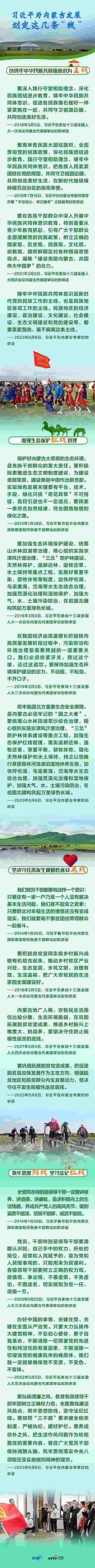 6月8日,習(xí)近平總書記聽取內(nèi)蒙古自治區(qū)黨委和政府工作匯報后發(fā)表講話,強調(diào)內(nèi)蒙古要“以鑄牢中華民族共同體意識為主線”,“加強生態(tài)保護紅線管理”,“堅決守住不發(fā)生規(guī)模性返貧底線”,“筑牢思想防線,堅守法紀紅線”。