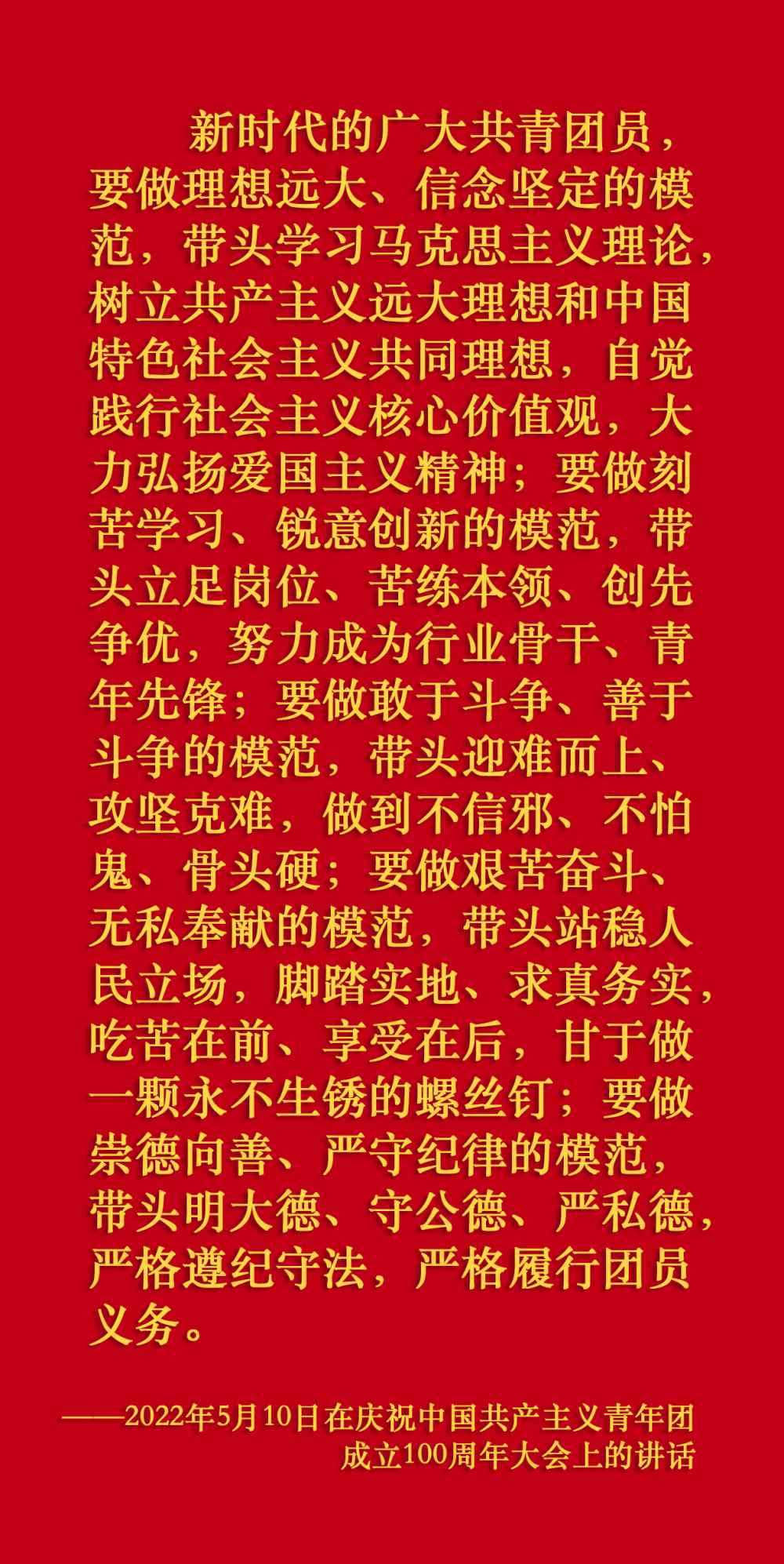在慶祝中國共產主義青年團成立100周年大會上,習近平總書記從黨和國家事業(yè)發(fā)展全局出發(fā),給共青團明確提出了4點希望,飽含深情、催人奮進。