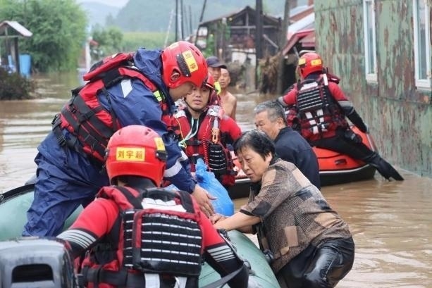 △8月4日,在黑龍江尚志市一面坡鎮(zhèn)萬(wàn)山村,哈爾濱市森林消防隊(duì)員解救被困村民。