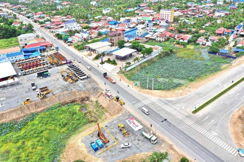 這是6月5日在柬埔寨干丹省拍攝的金巴高速公路施工起點(diǎn)(無人機(jī)照片)。