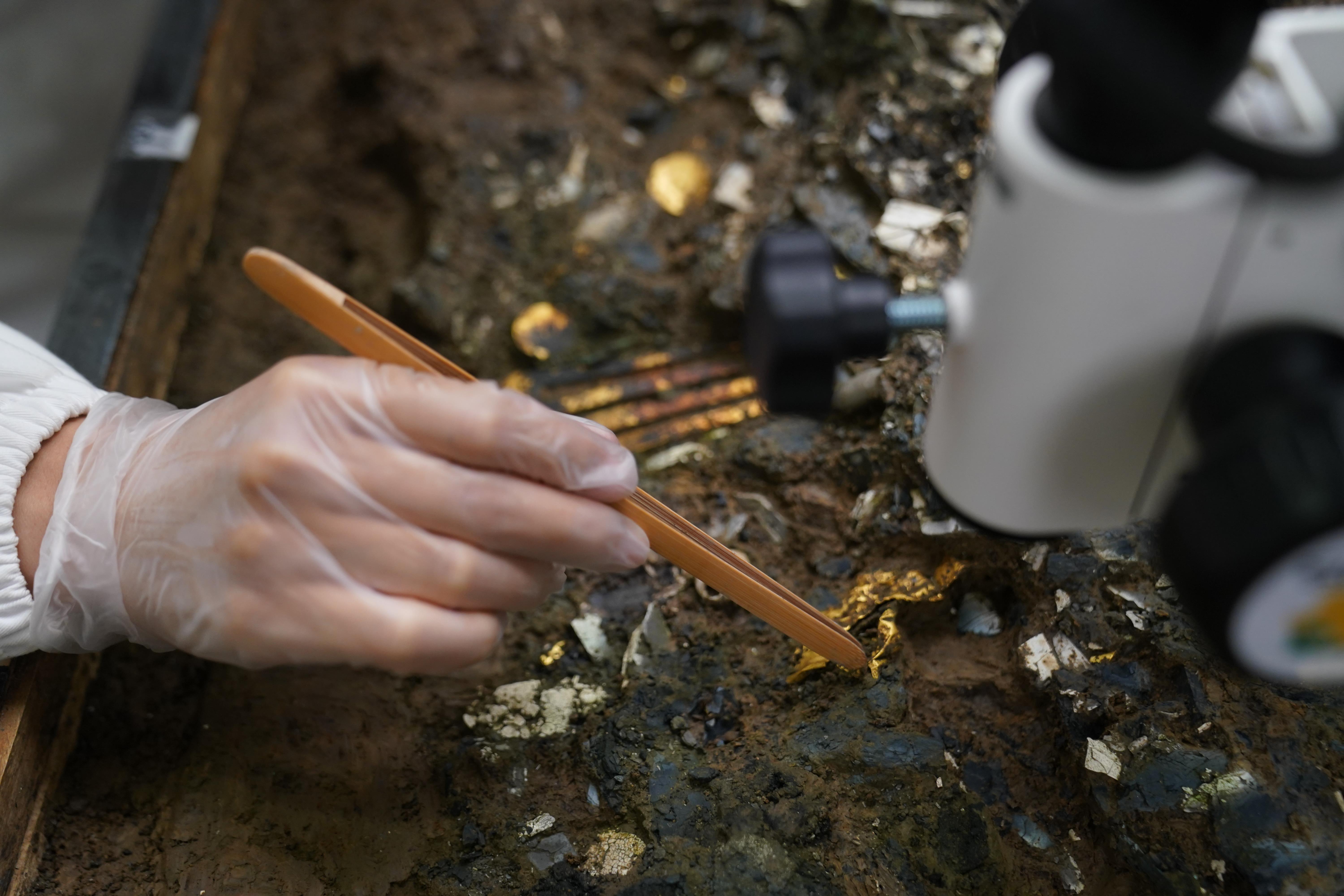 △三星堆博物館文物保護(hù)修復(fù)館內(nèi),三星堆文物修復(fù)人員正在對出土文物進(jìn)行清理。(總臺國廣記者李晉拍攝)