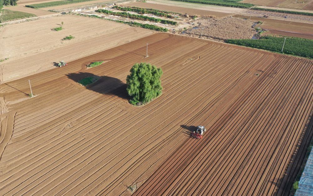 8月18日,在河北省涿州市刁窩鎮(zhèn)潘各莊村,農(nóng)民駕駛農(nóng)業(yè)機(jī)械進(jìn)行復(fù)耕補(bǔ)種作業(yè)(無(wú)人機(jī)照片)。