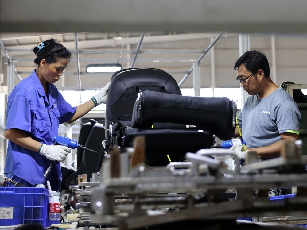 8月19日,工人在位于河北省涿州市的麥格納宏立汽車(chē)系統(tǒng)(河北)有限公司生產(chǎn)車(chē)間工作。