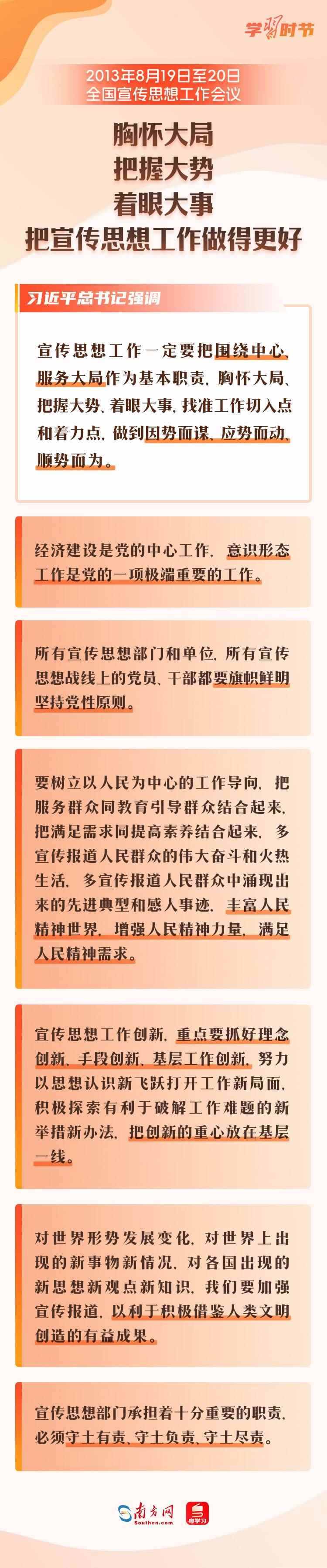 宣傳思想文化工作事關(guān)黨的前途命運(yùn),事關(guān)國(guó)家長(zhǎng)治久安,事關(guān)民族凝聚力和向心力,是一項(xiàng)極端重要的工作。黨的十八大以來(lái),宣傳思想文化工作之所以取得歷史性成就,最根本就在于有習(xí)近平總書記領(lǐng)航掌舵,有習(xí)近平新時(shí)代中國(guó)特色社會(huì)主義思想科學(xué)指引。讓我們一同回顧剛剛召開(kāi)的全國(guó)宣傳思想文化工作會(huì)議,以及2018年、2013年召開(kāi)的兩次全國(guó)宣傳思想工作會(huì)議,看看總書記通過(guò)這三次會(huì)議,為宣傳思想文化工作劃出了哪些重點(diǎn)。