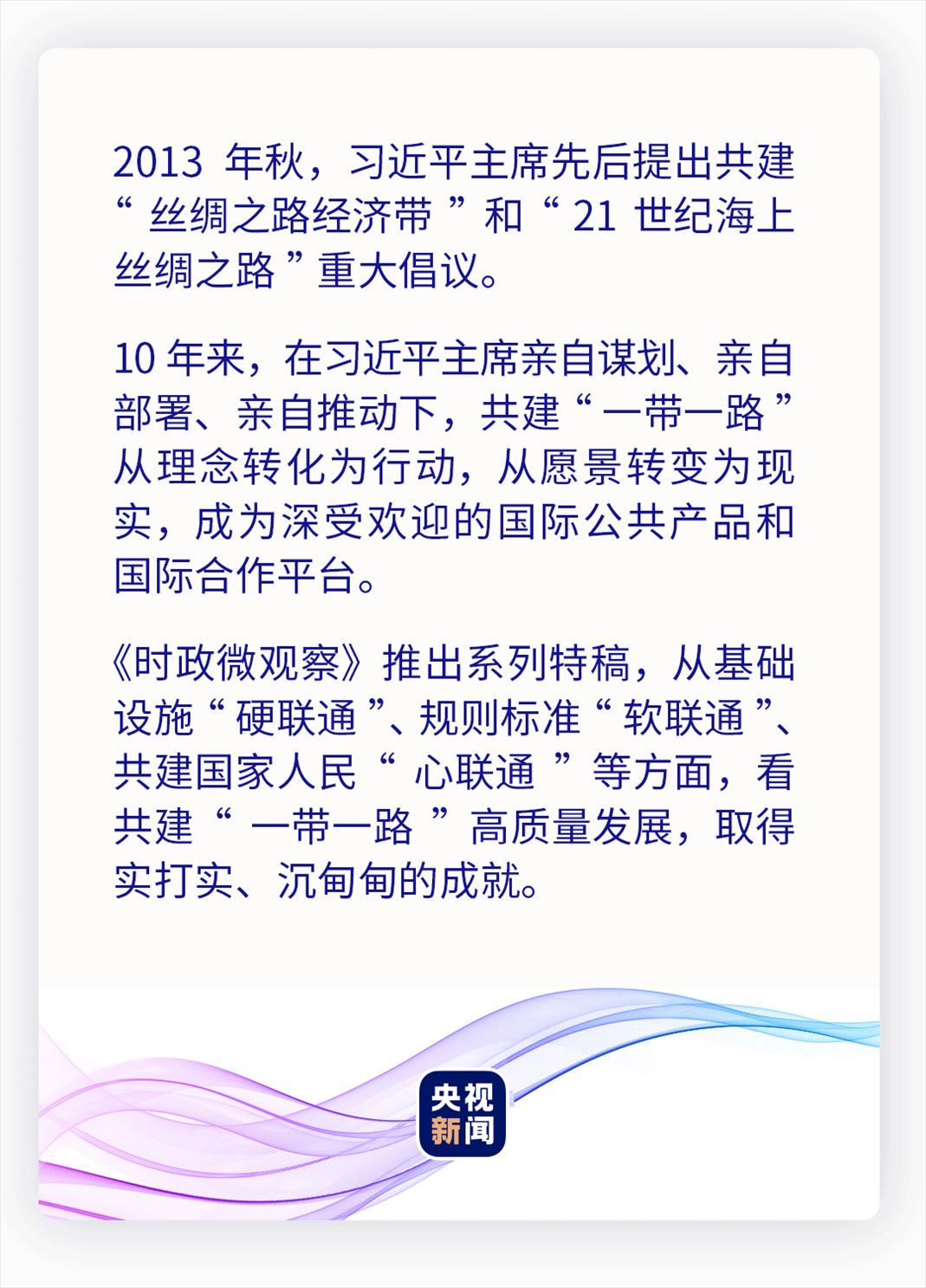 10年來(lái),共建“一帶一路”以高標(biāo)準(zhǔn)、可持續(xù)、惠民生為目標(biāo),以規(guī)則標(biāo)準(zhǔn)“軟聯(lián)通”為重要支撐,為促進(jìn)全球互聯(lián)互通、共同發(fā)展增添新動(dòng)力,推動(dòng)高質(zhì)量共建“一帶一路”不斷走深走實(shí)。