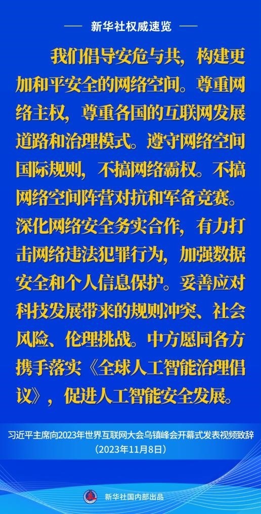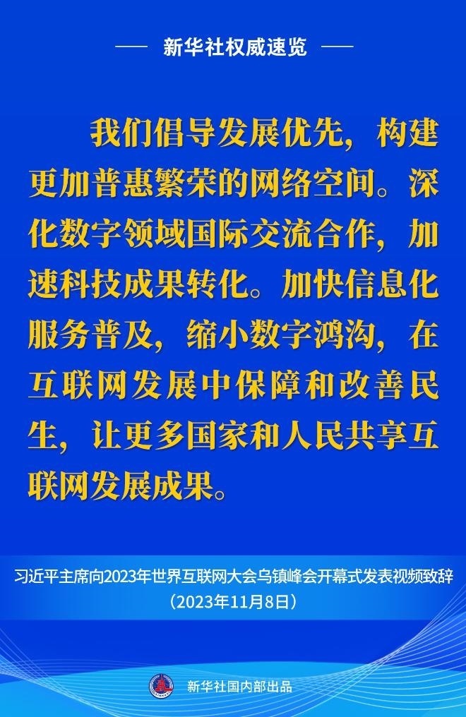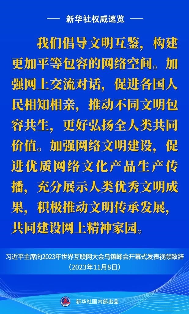 11月8日上午,國(guó)家主席習(xí)近平向2023年世界互聯(lián)網(wǎng)大會(huì)烏鎮(zhèn)峰會(huì)開(kāi)幕式發(fā)表視頻致辭。一起來(lái)看金句。