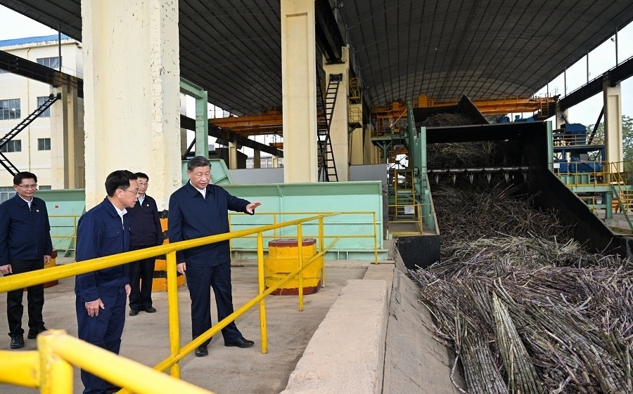 14日下午,習(xí)近平總書記在廣西來賓市考察調(diào)研。他先后來到來賓市國家現(xiàn)代農(nóng)業(yè)產(chǎn)業(yè)園黃安優(yōu)質(zhì)“雙高”糖料蔗基地和東糖鳳凰有限公司,了解甘蔗良種繁育、種植收成、糖產(chǎn)業(yè)發(fā)展等情況。(人民日報(bào)記者 徐雋)