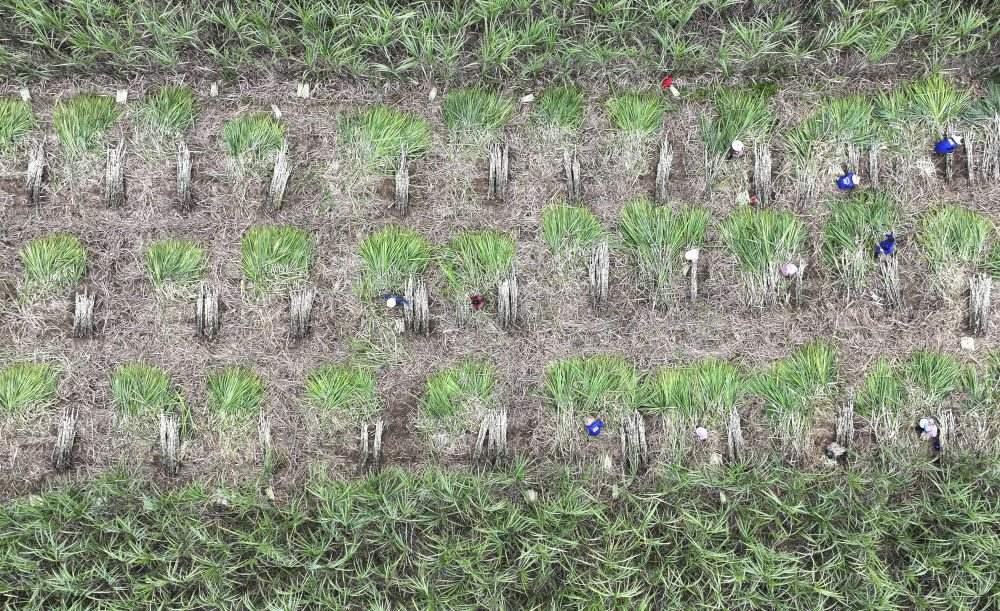2023年12月12日,在廣西來賓市興賓區(qū)小平陽(yáng)鎮(zhèn),農(nóng)民在收割甘蔗(無人機(jī)照片)。新華社記者 周華 攝