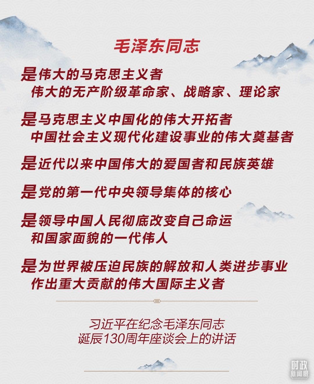 《時(shí)政新聞眼》注意到,與10年前的講話相比,總書(shū)記在今年這次座談會(huì)上增加了兩個(gè)新的表述:毛澤東同志是“中國(guó)社會(huì)主義現(xiàn)代化建設(shè)事業(yè)的偉大奠基者”,“是為世界被壓迫民族的解放和人類進(jìn)步事業(yè)作出重大貢獻(xiàn)的偉大國(guó)際主義者”。