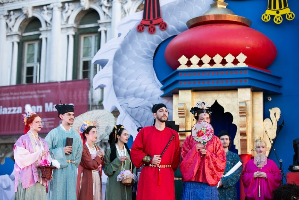 2024年2月13日,在意大利威尼斯,志愿者身著漢服進(jìn)行表演。新華社記者 李京 攝