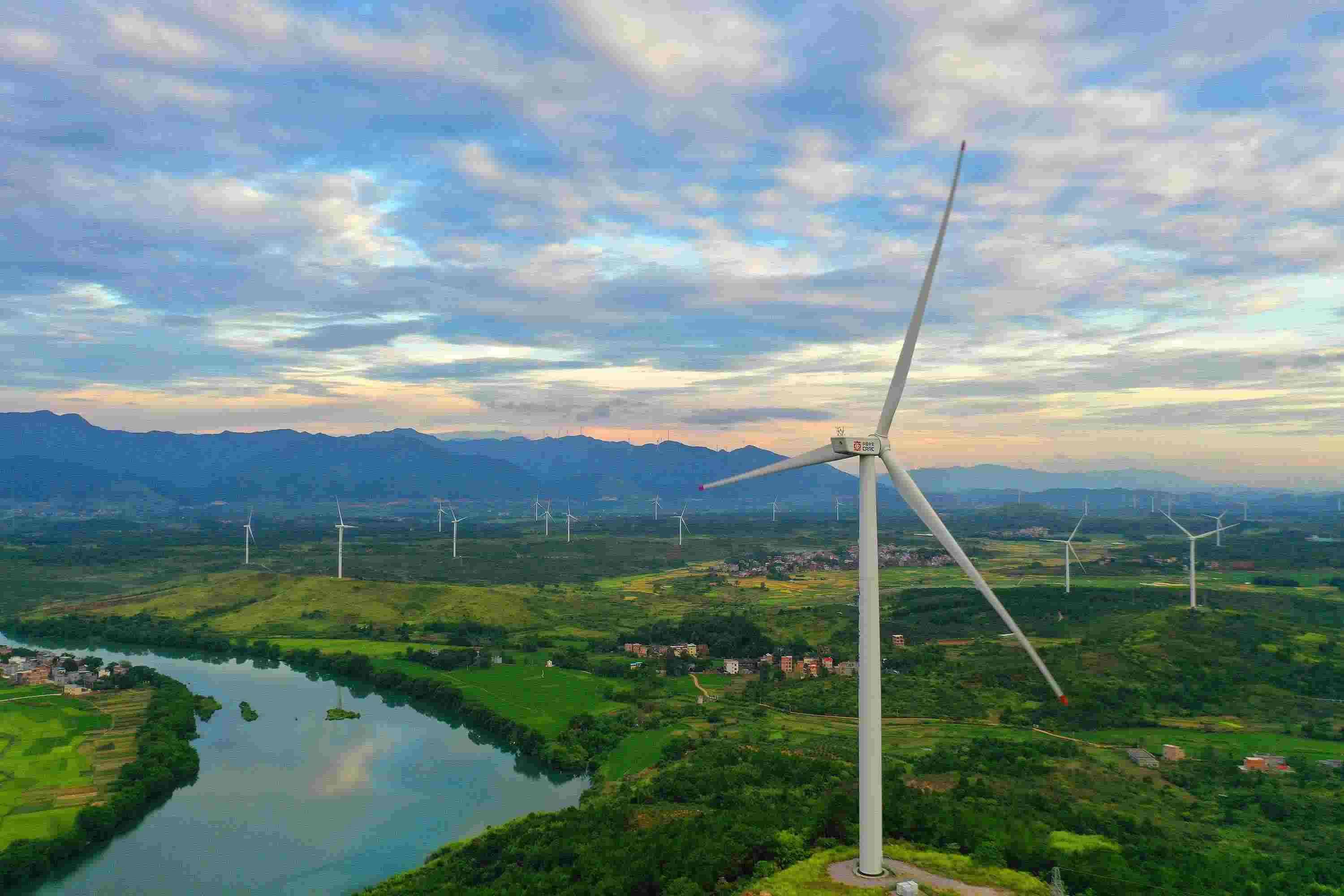 △ 湖南省永州市的風(fēng)力發(fā)電風(fēng)車與藍(lán)天、綠水、田野交相輝映,構(gòu)成一幅美麗的生態(tài)畫卷。