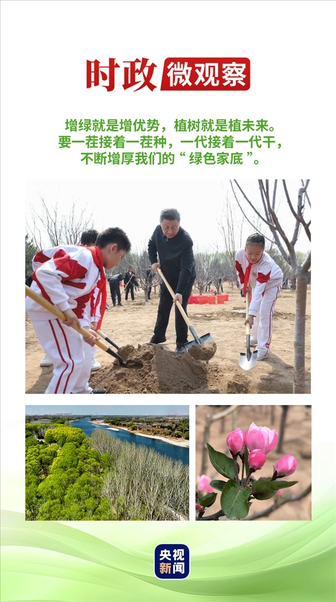 一次次揮鍬鏟土、培土圍堰、提水澆灌,總書記身體力行、率先垂范,就是要號召大家都行動(dòng)起來,積極參與植樹造林,人人爭當(dāng)綠色使者、生態(tài)先鋒,為建設(shè)美麗中國增綠添彩,共同譜寫人與自然和諧共生的中國式現(xiàn)代化新篇章。