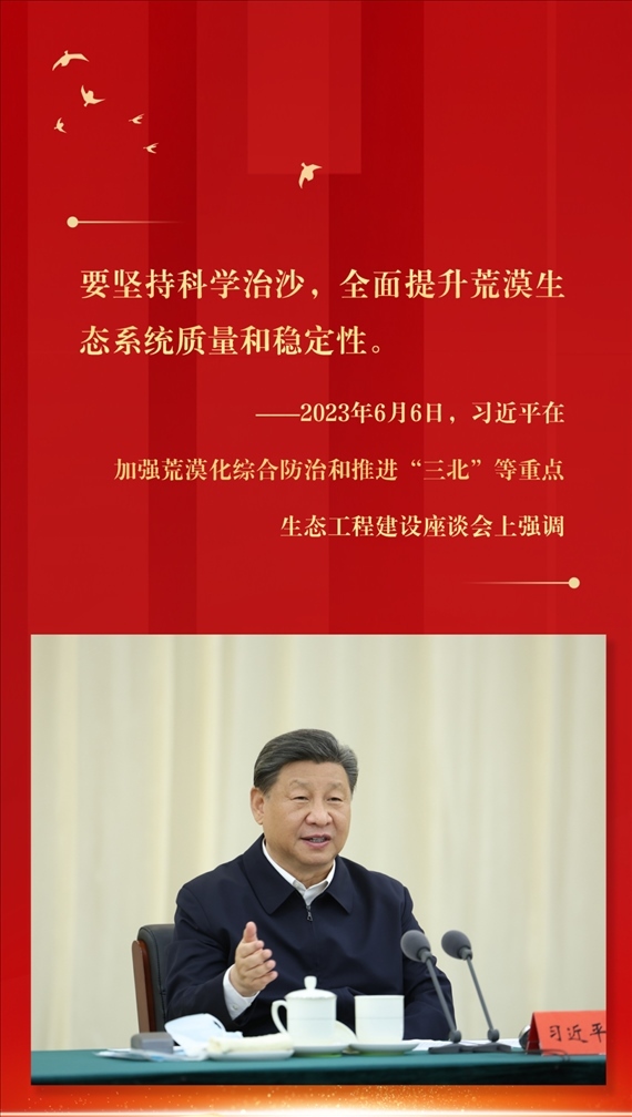 2023年6月5日至6日,習(xí)近平在內(nèi)蒙古巴彥淖爾考察,并主持召開加強荒漠化綜合防治和推進(jìn)“三北”等重點生態(tài)工程建設(shè)座談會。這是6日上午,習(xí)近平在臨河區(qū)國營新華林場考察。