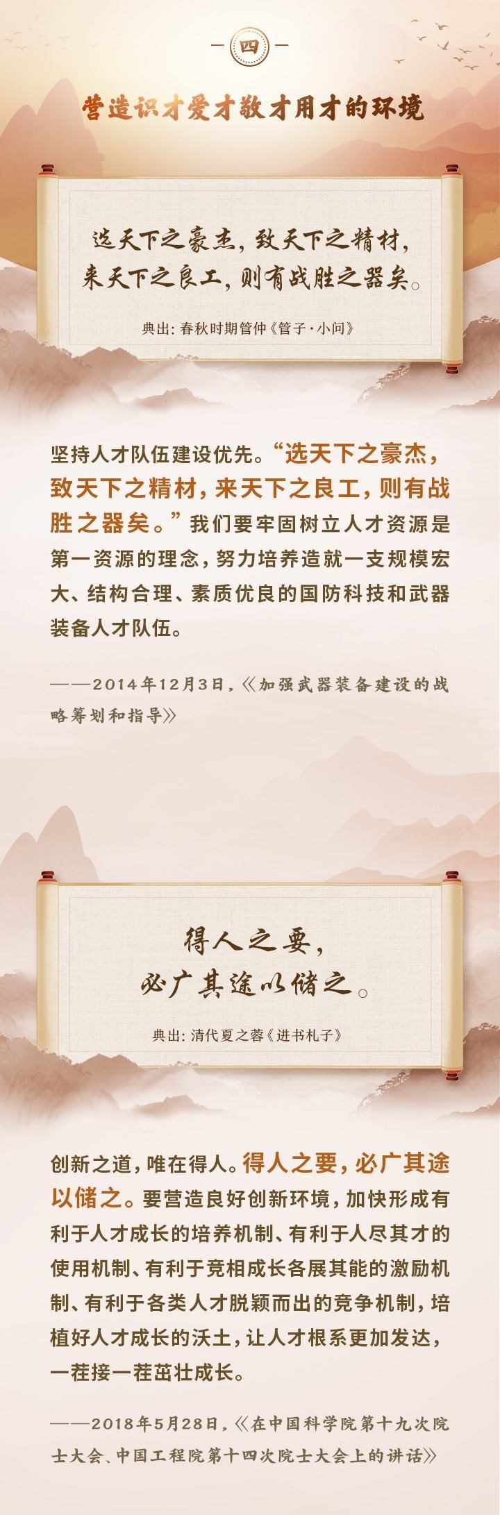 編者按:培養(yǎng)造就大批德才兼?zhèn)涞母咚刭|(zhì)人才,是國家和民族長遠發(fā)展大計。黨的十八大以來,習近平總書記圍繞人才工作發(fā)表一系列重要論述,立意高遠,內(nèi)涵豐富,思想深刻,深刻回答了為什么建設人才強國、什么是人才強國、怎樣建設人才強國的重大理論和實踐問題。在這些重要論述中,總書記精妙運用古代典籍、經(jīng)典名句,以古喻今、啟迪思想、激蕩精神,讓我們一起來學習!