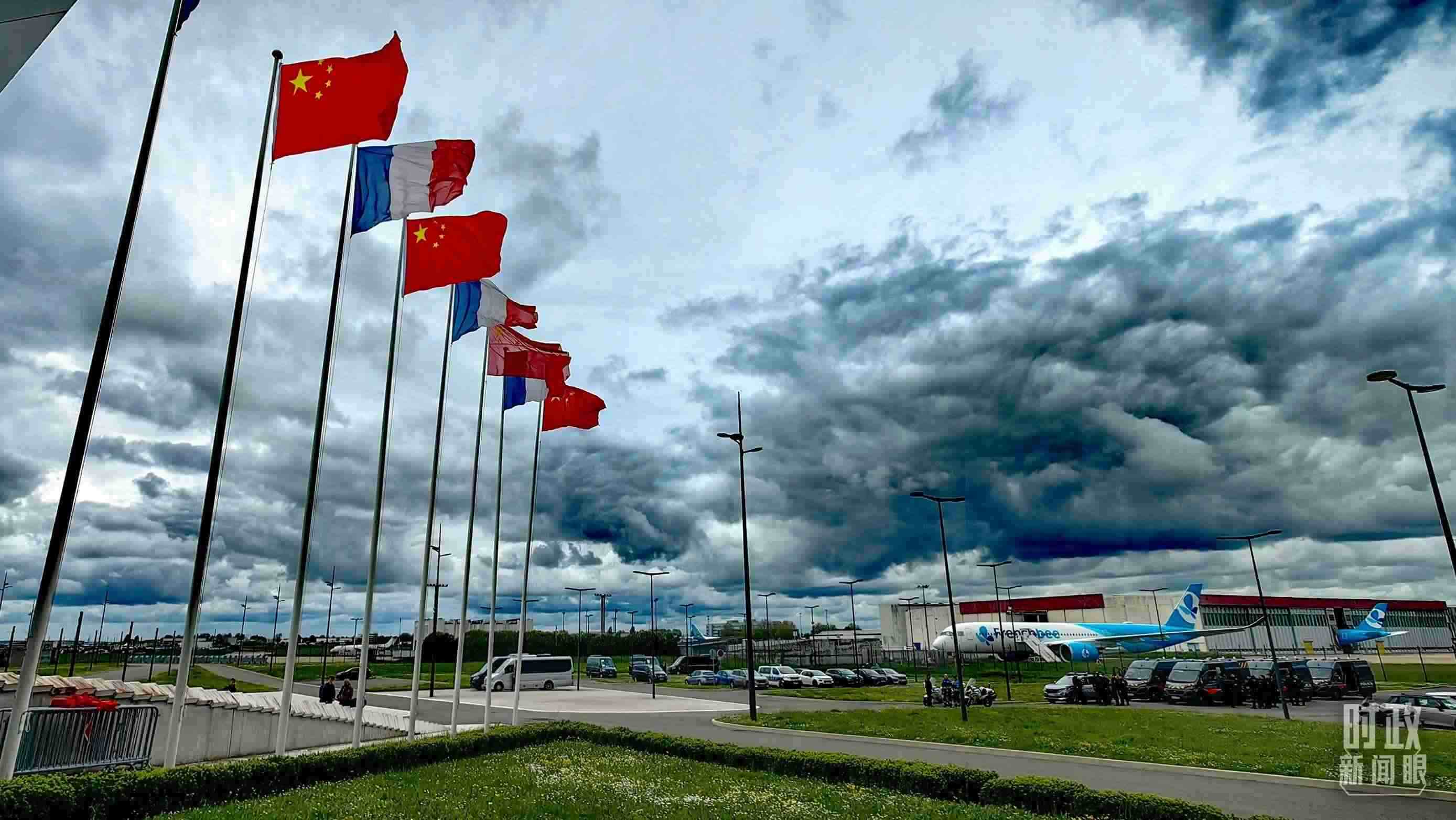 △巴黎奧利機場,中法兩國國旗迎風招展。(總臺央視記者段德文拍攝)