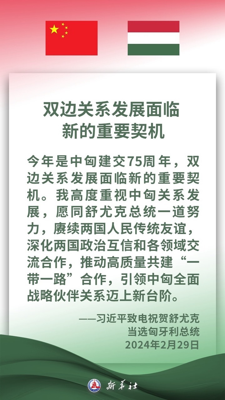 匈牙利是中東歐地區(qū)重要國家,是中方推進(jìn)共建“一帶一路”及中國-中東歐國家合作的重要合作伙伴。近年來,在兩國領(lǐng)導(dǎo)人的戰(zhàn)略引領(lǐng)下,中匈關(guān)系保持高水平發(fā)展,兩國高層交往密切,政治互信持續(xù)深化,各領(lǐng)域合作扎實(shí)推進(jìn)、成果豐碩,為兩國人民帶來切實(shí)利益。習(xí)近平主席說,中方愿同匈方繼續(xù)做彼此信賴、合作共贏的好朋友、好伙伴。