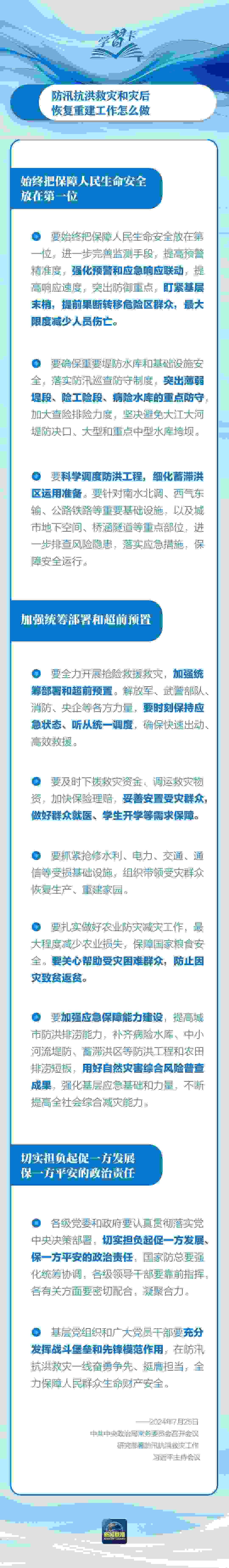 近日,中共中央政治局常委會召開會議,研究部署防汛抗洪救災(zāi)工作,習(xí)近平主持會議并發(fā)表重要講話。