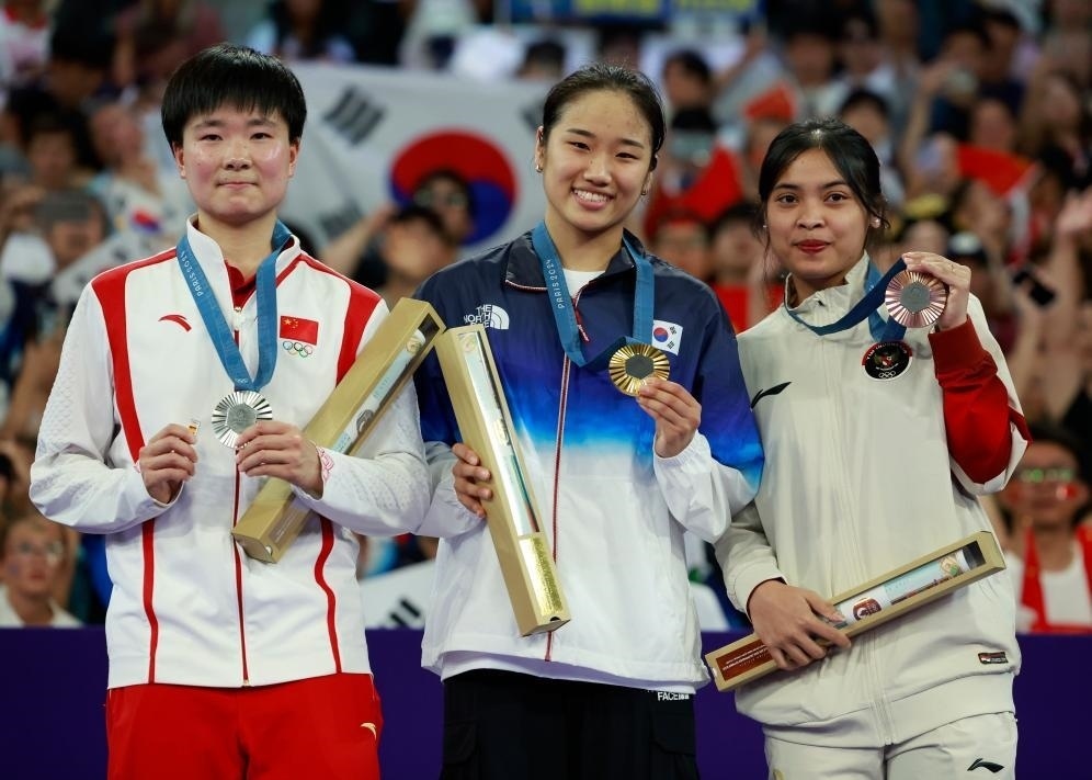 △8月5日,羽毛球女單冠軍韓國(guó)選手安洗瑩(中)、亞軍中國(guó)選手何冰嬌(左)、季軍印度尼西亞選手瑪麗斯卡在頒獎(jiǎng)儀式上。