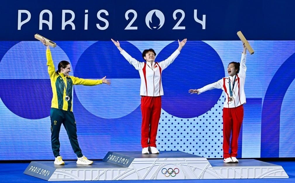 △在巴黎奧運(yùn)會(huì)跳水項(xiàng)目女子3米板決賽中,中國(guó)選手陳藝文獲得金牌,中國(guó)選手昌雅妮獲得銅牌。